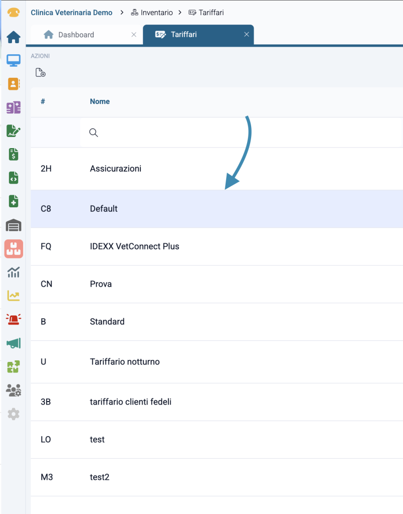 Selezionare quindi il tariffario al quale desideri aggiungere le prestazioni.