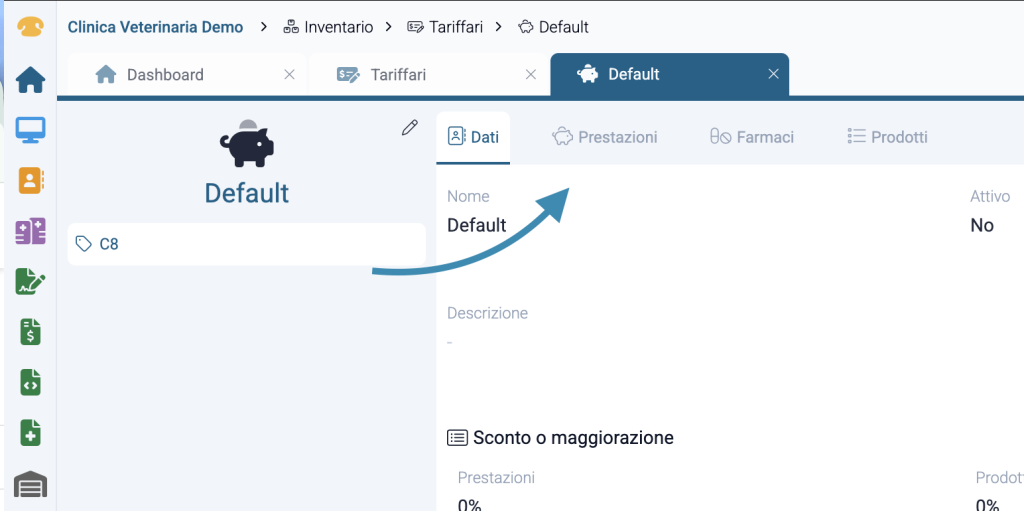 Una volta all’interno del tariffario interessato cliccare sulla voce “prestazioni” affianco a “dati”.