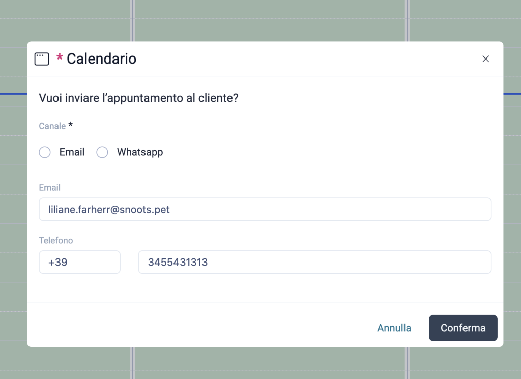 N.B Il canale “e-mail” è automatico e in totale al cliente arriveranno 2 promemoria: il primo il giorno in cui inserite l’appuntamento e il secondo, il giorno prima dell’appuntamento. Whatsapp invece prevedere un invio manuale, Snoots PMS apre whatsapp e inserisce un template di testo, toccherà a te però dare invio al messaggio.